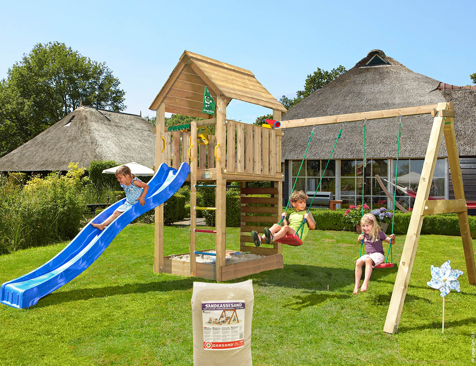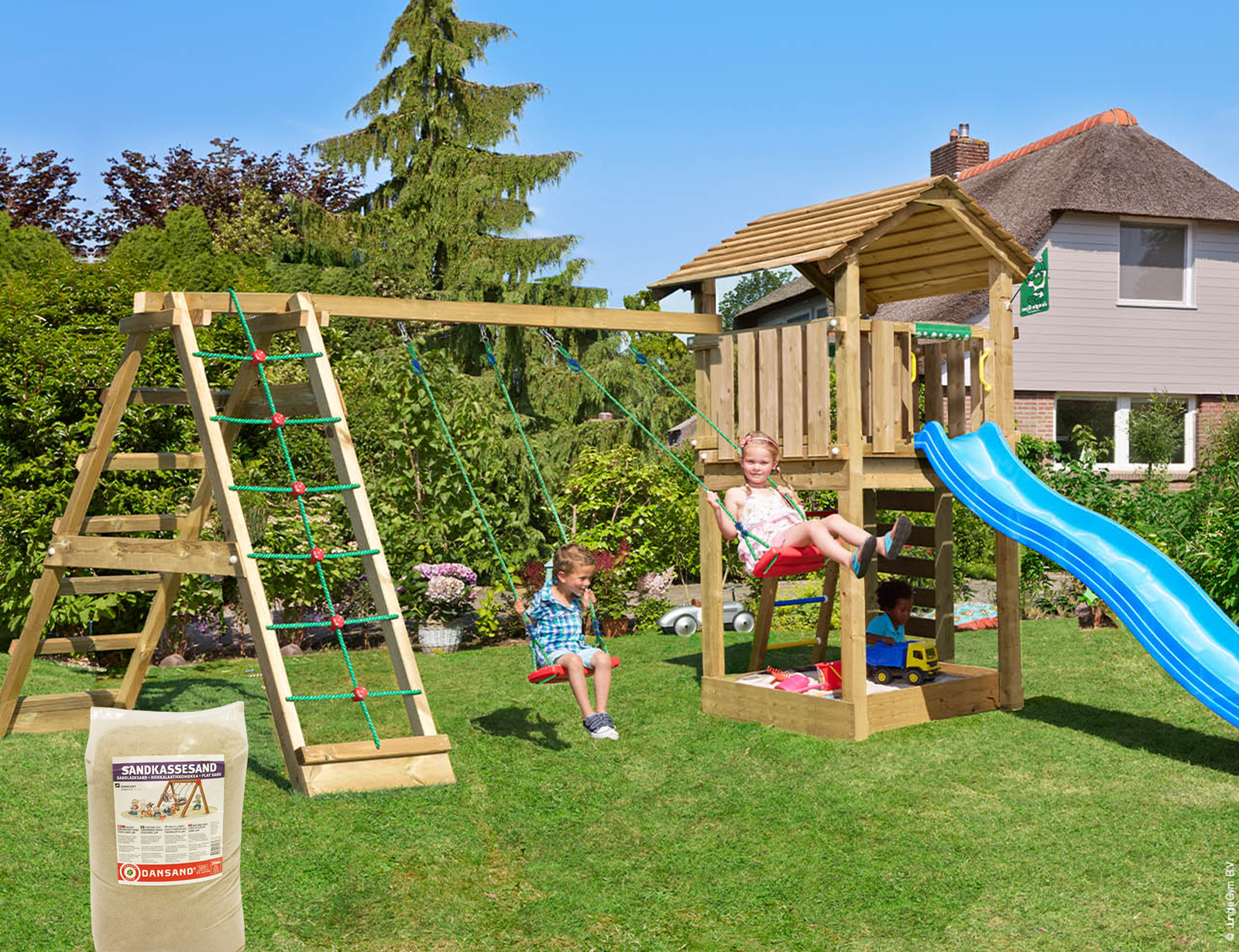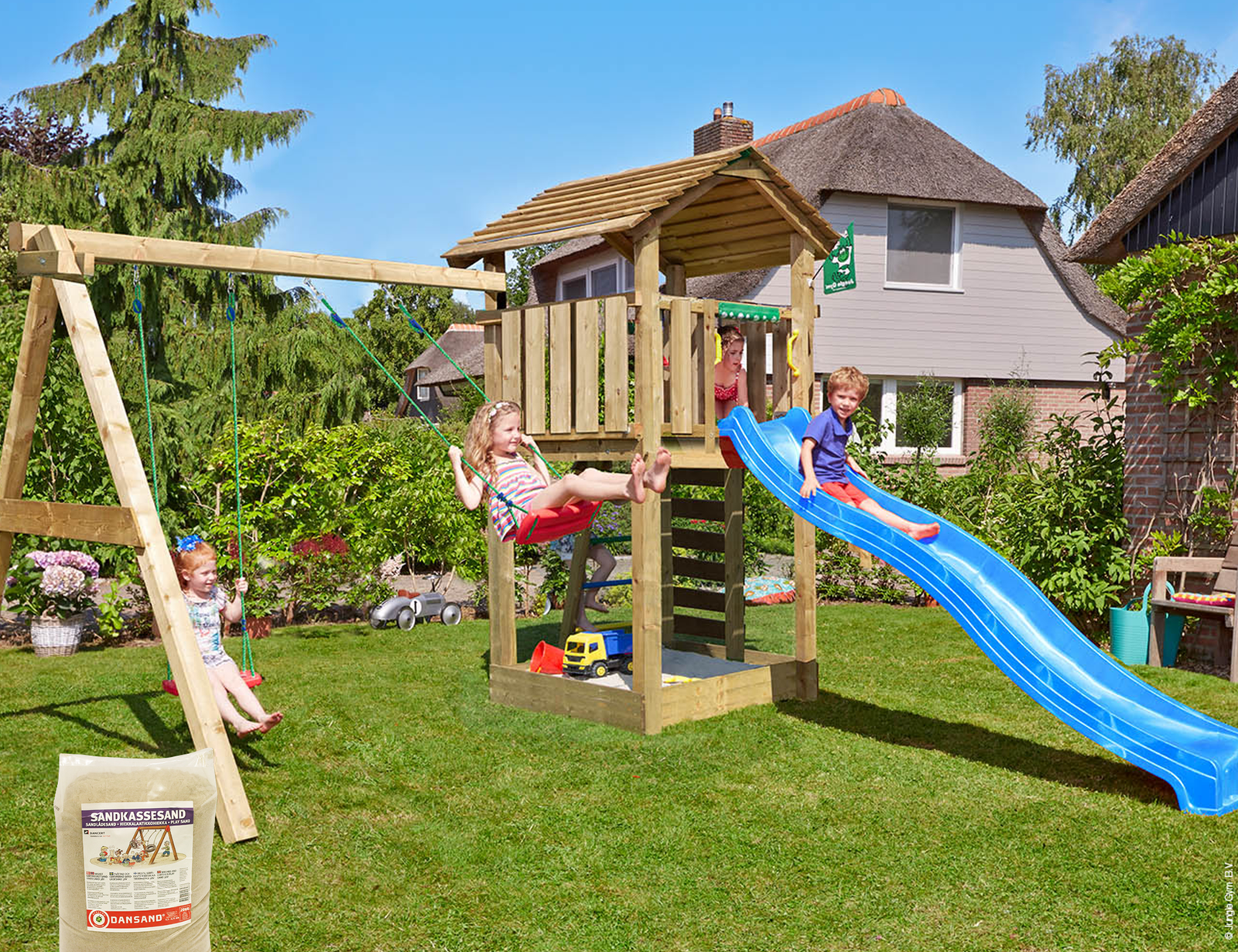 Jungle Gym – Legetårn Jungle Gym Cottage 2.1 m/2-Swing Modul 220, blå rutschebane og 120 kg sand