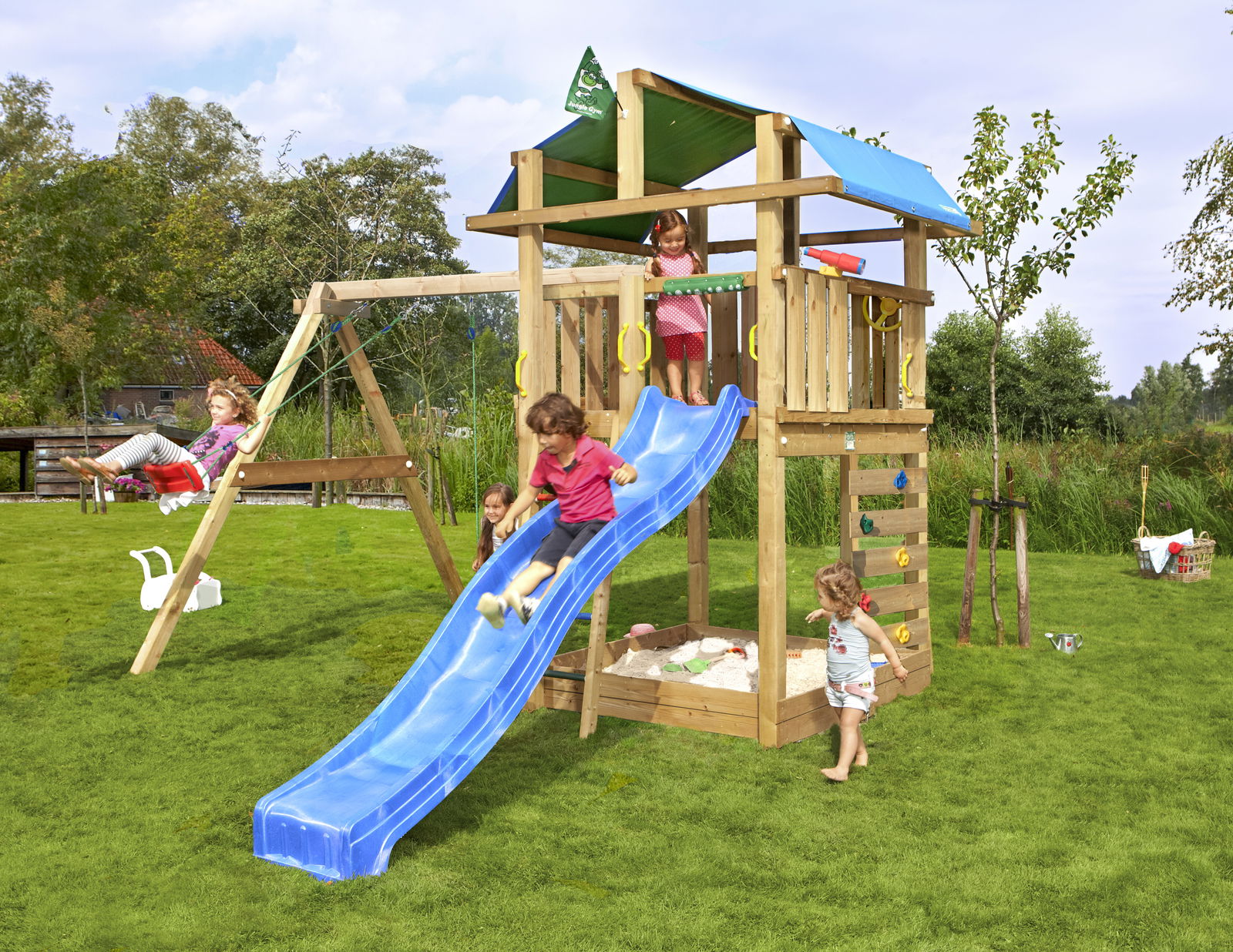 Legetårn Jungle Gym Lodge 2.1 inkl. Swing Module og blå rutschebane