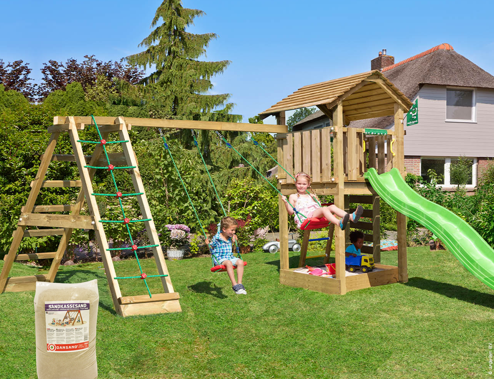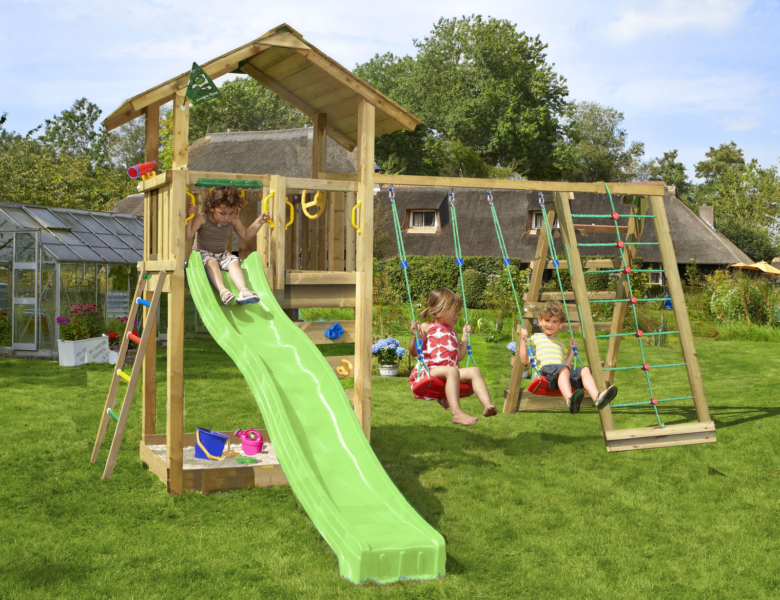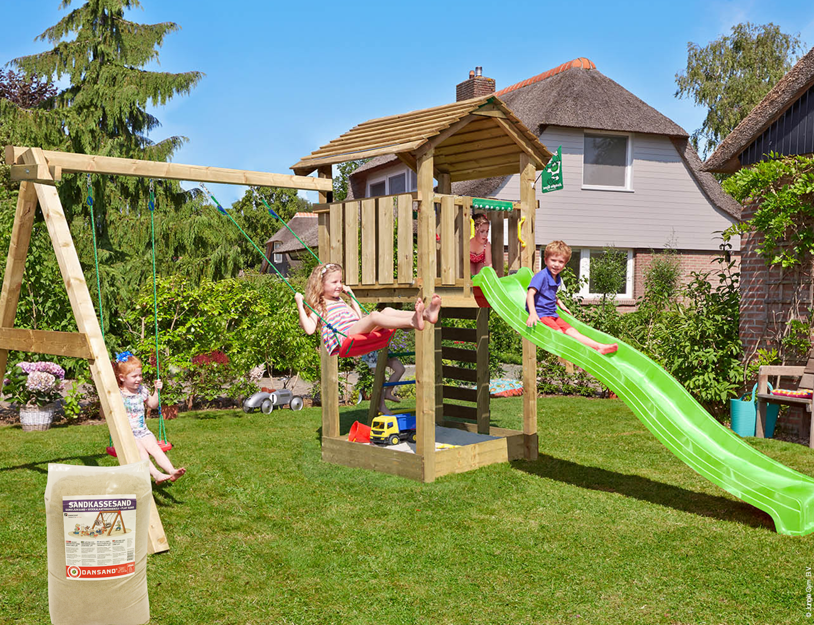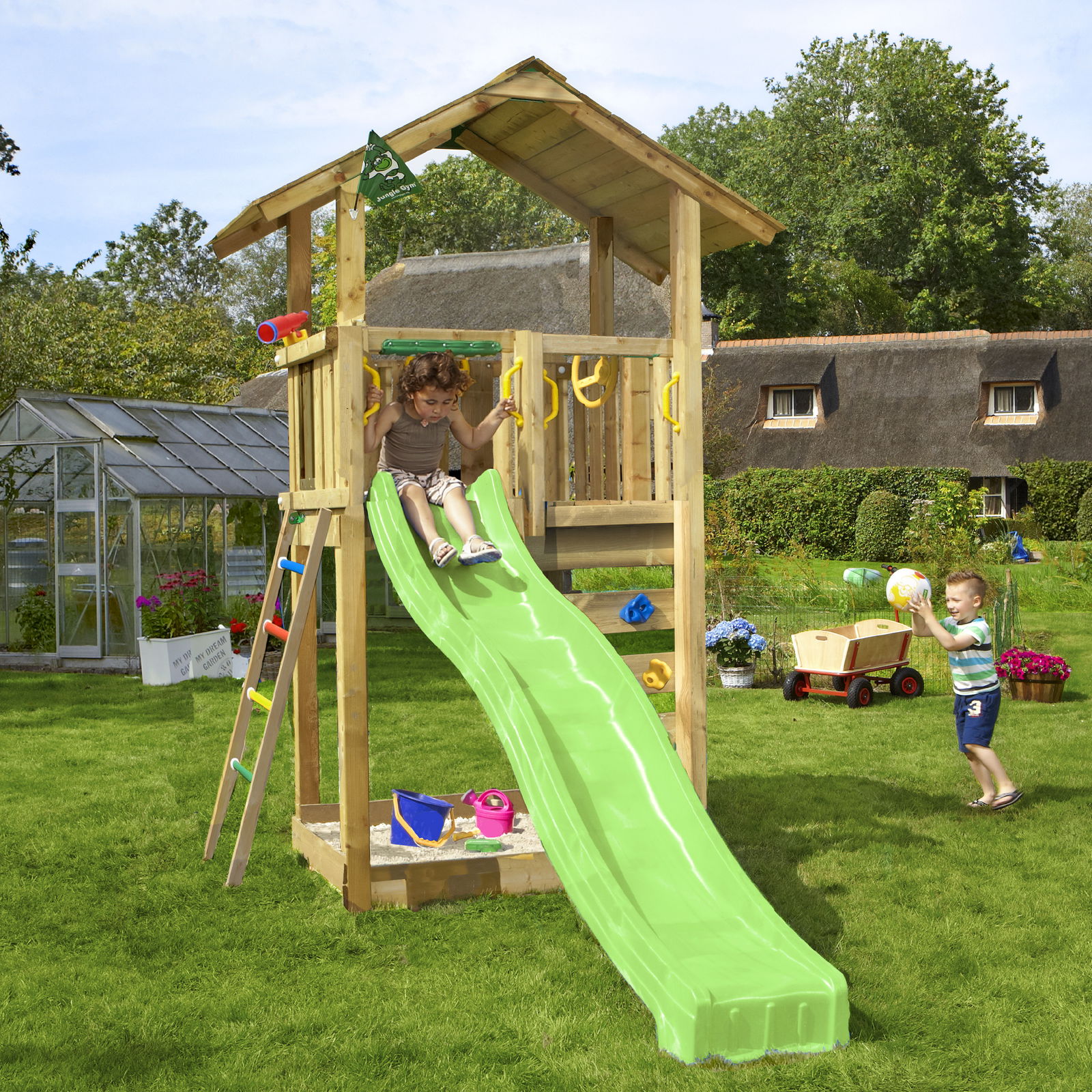 Jungle Gym – Legetårn Jungle Gym Cottage 2.1 m/grøn rutschebane og 120 kg sand