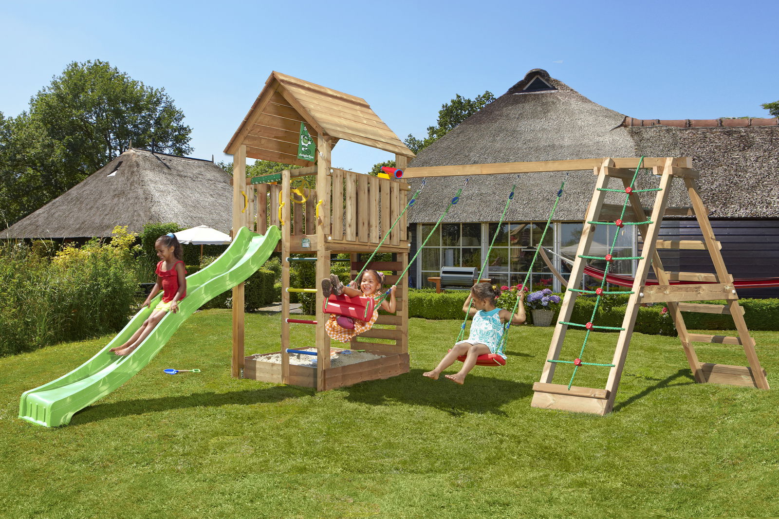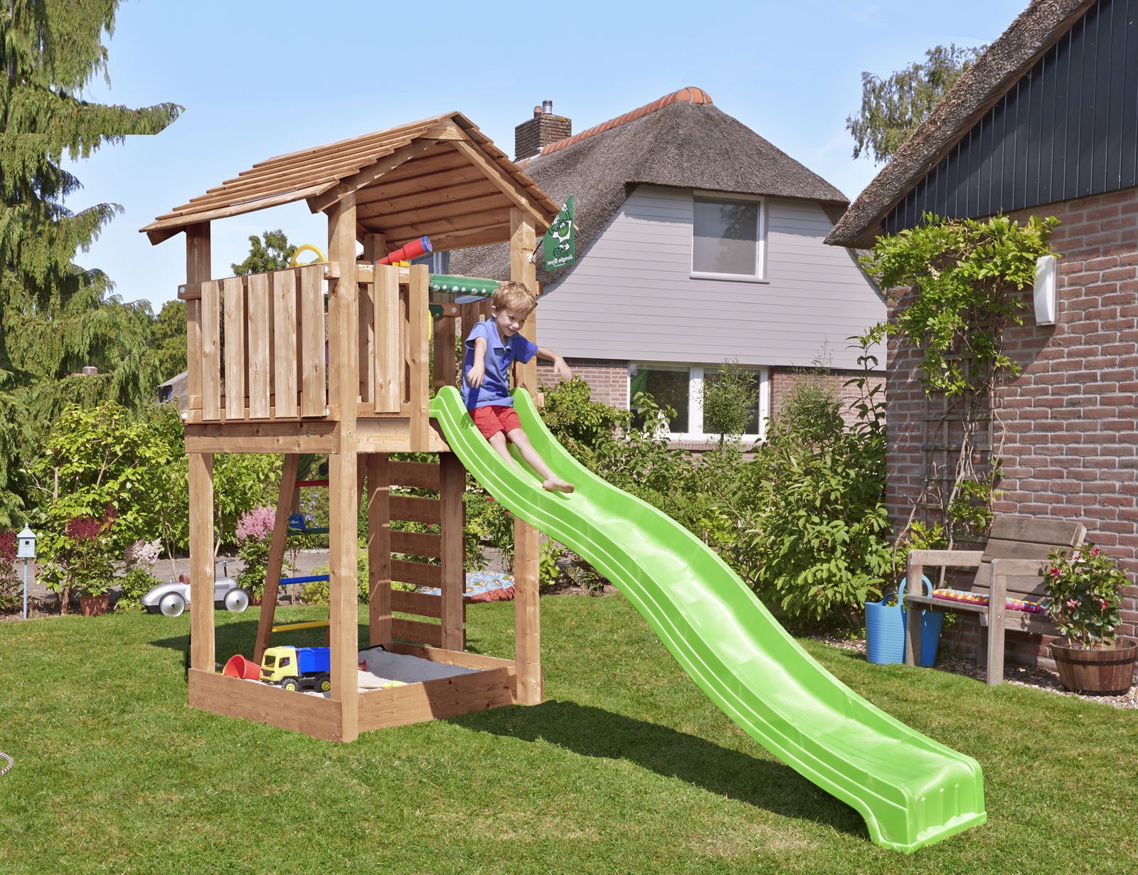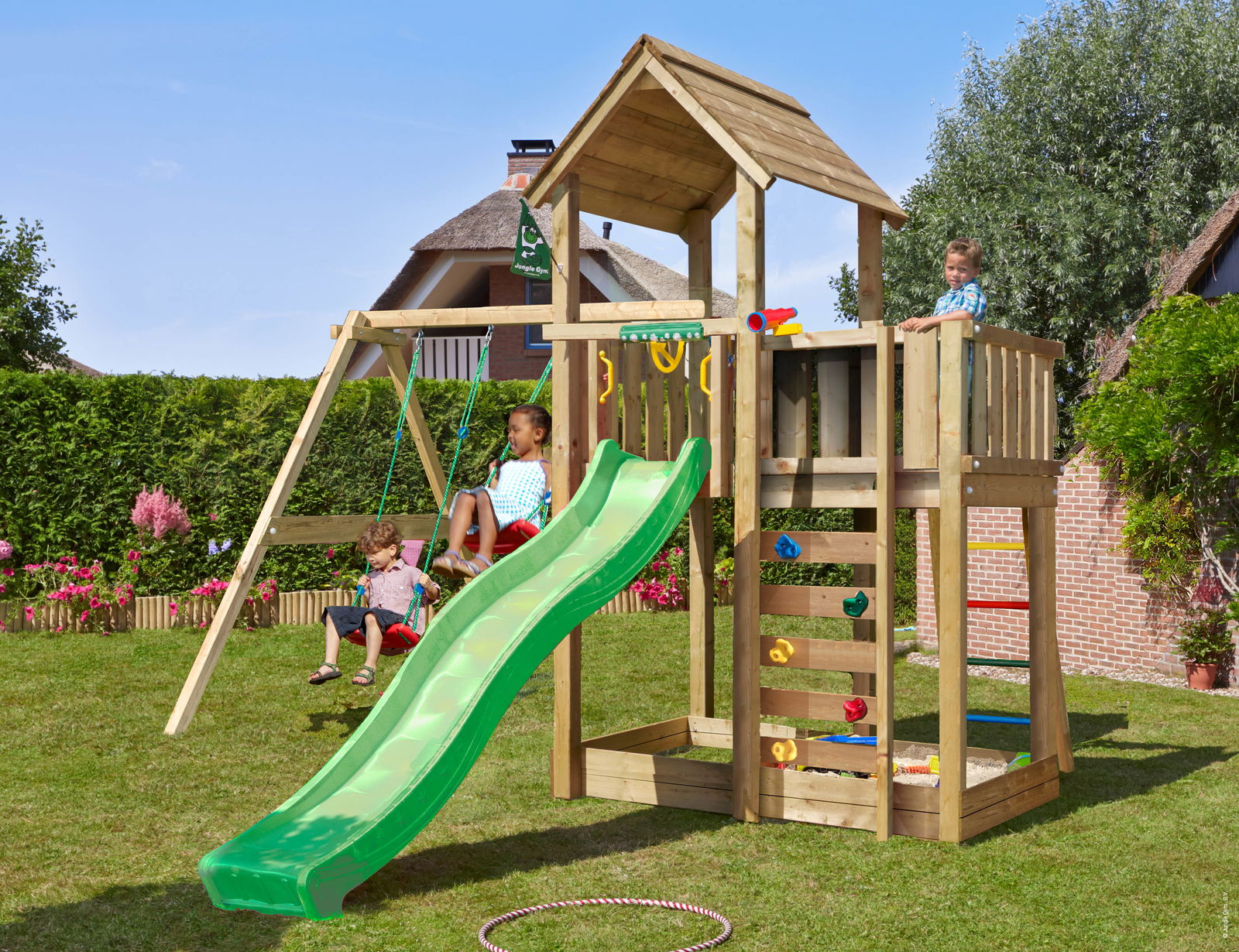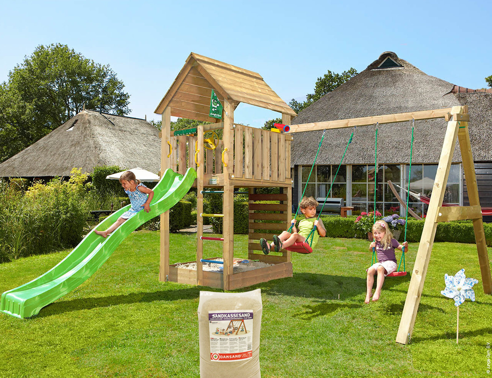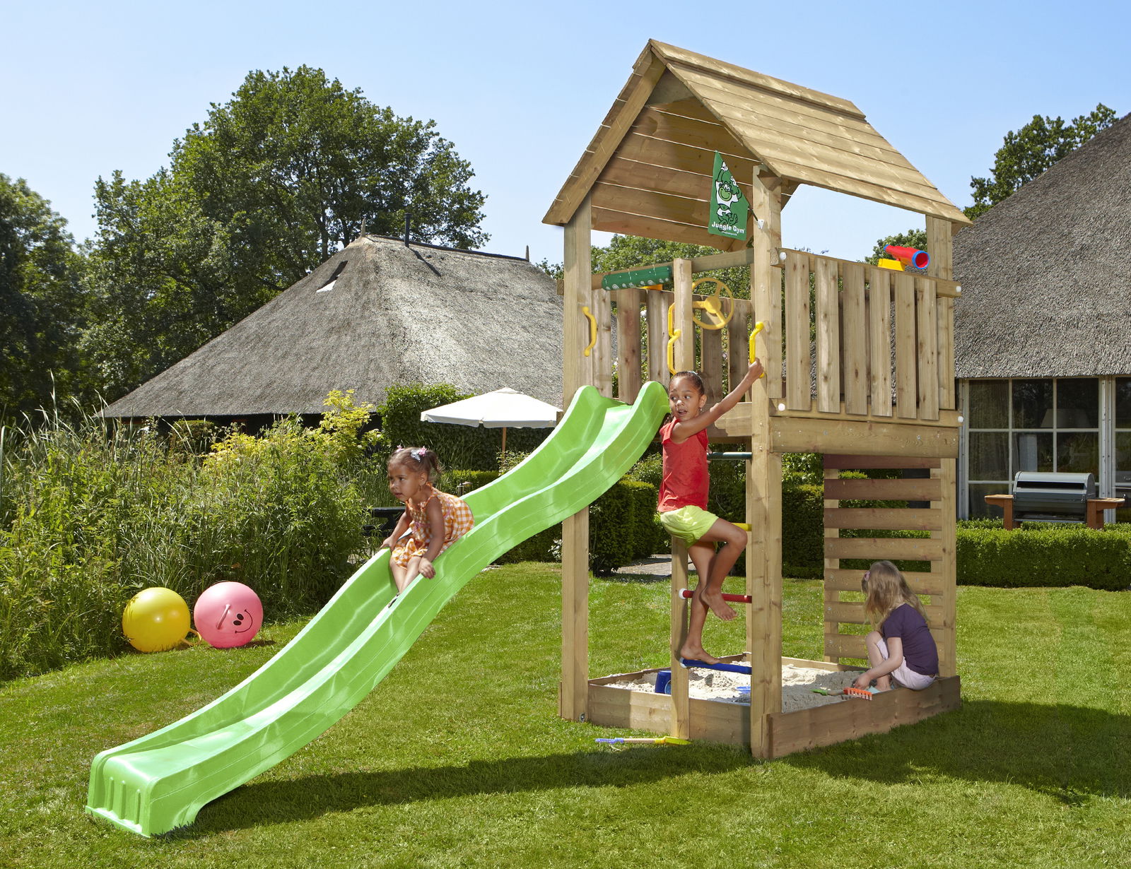 Jungle Gym – Legetårn Jungle Gym Cottage 2.1 m/grøn rutschebane og 120 kg sand