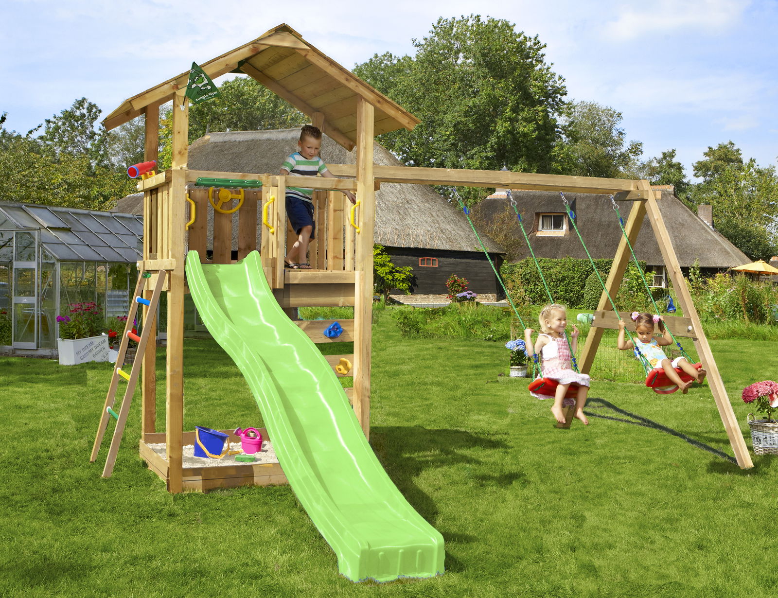 Legetårn Jungle Gym Cottage 2.1 m/2-Swing Modul 220, grøn rutschebane og 120 kg sand