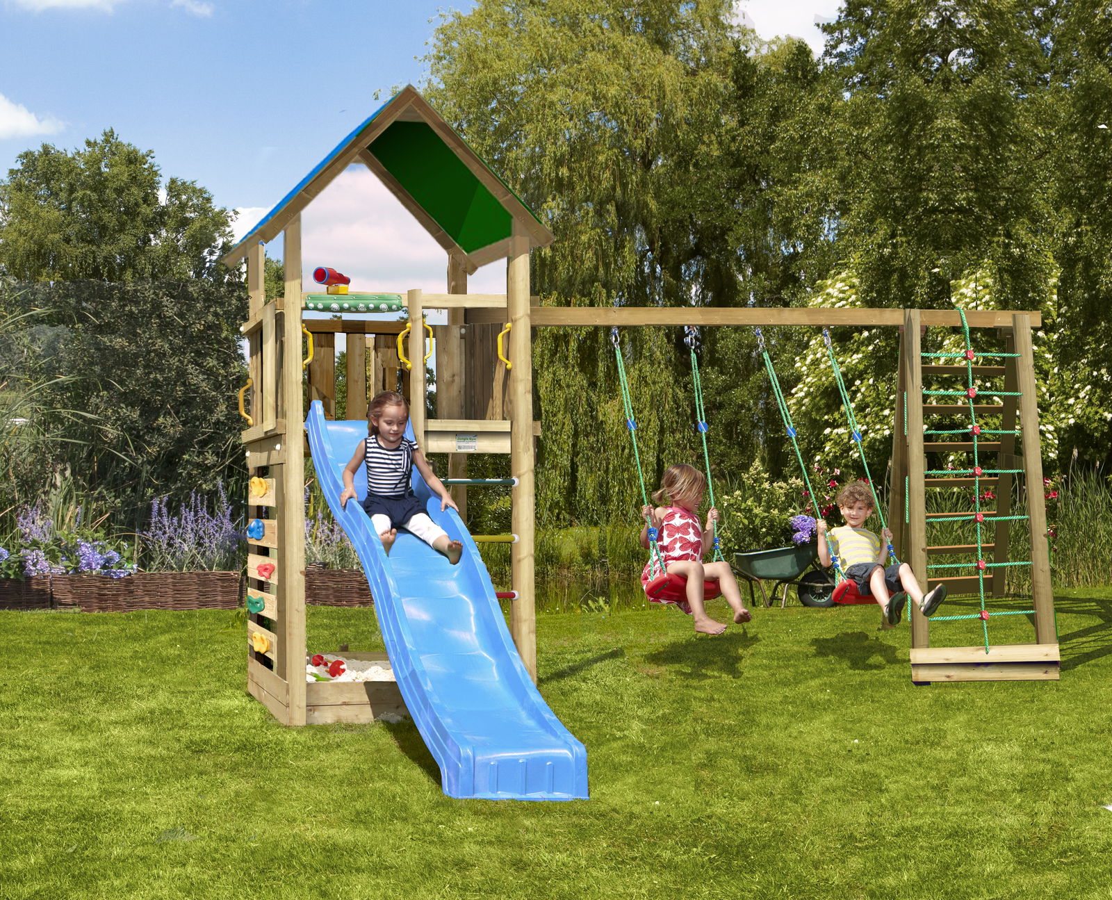 Jungle Gym – Legetårn Jungle Gym Cht 2.1 alem/2-Swing Module 220, blå rutschebane og 120 kg sand