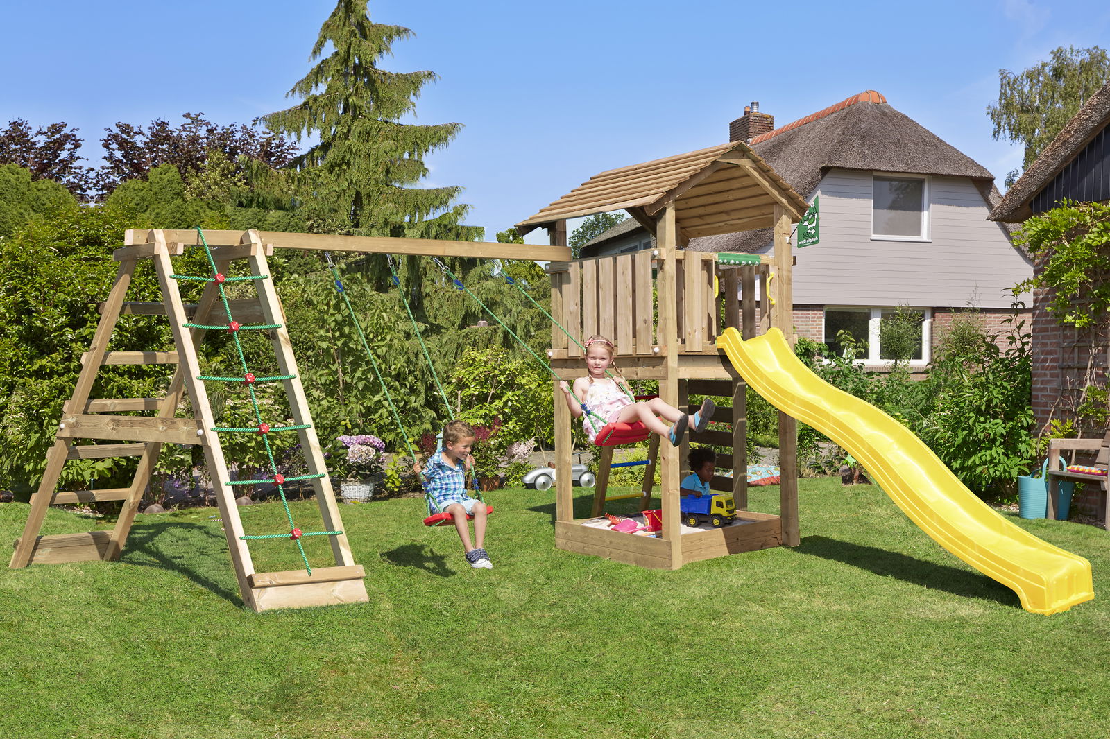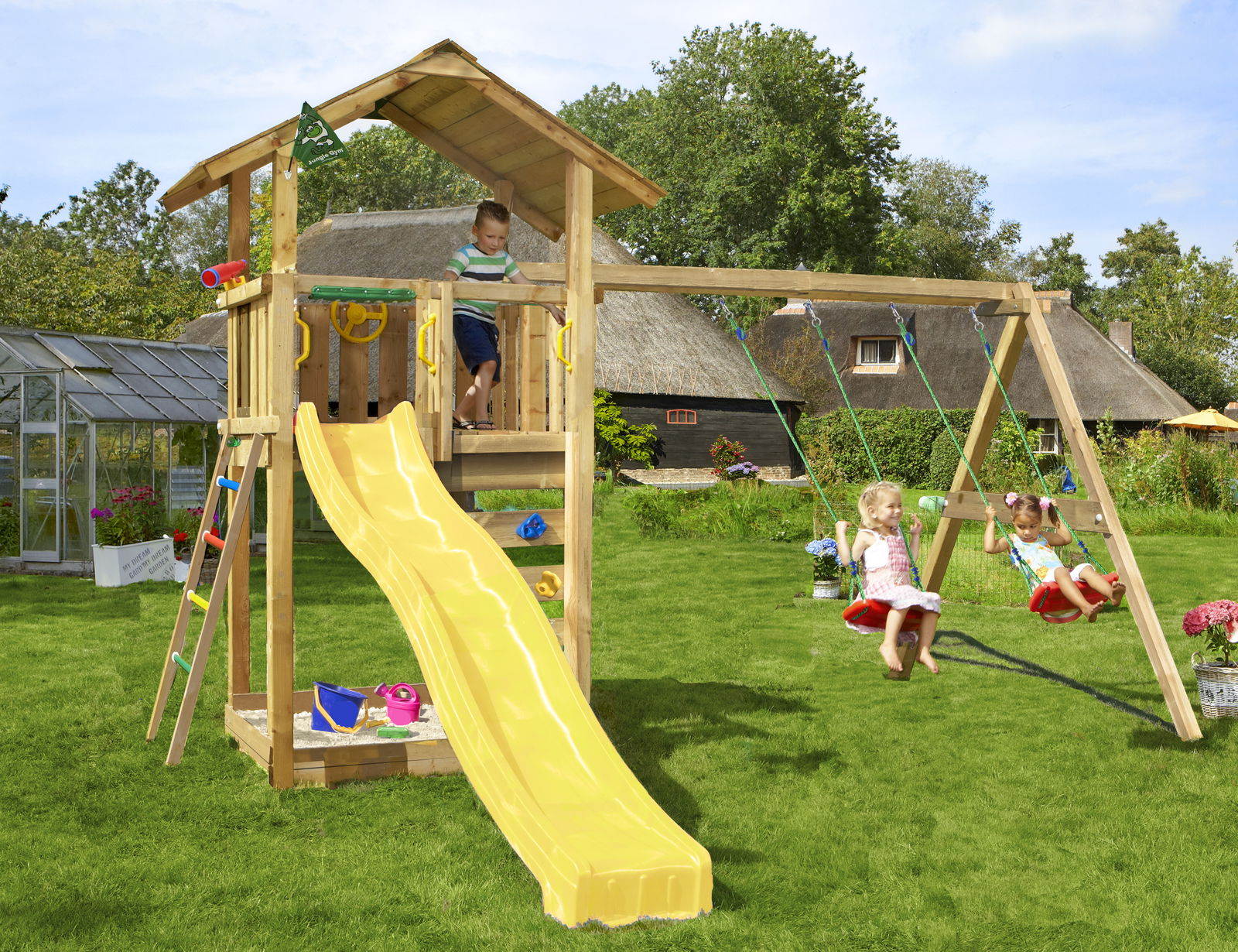 Legetårn Jungle Gym Cottage 2.1 m/2-Swing Modul 220 og gul rutschebane