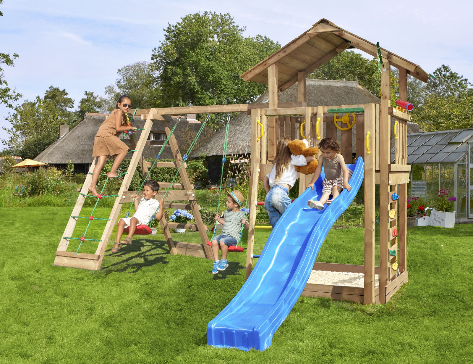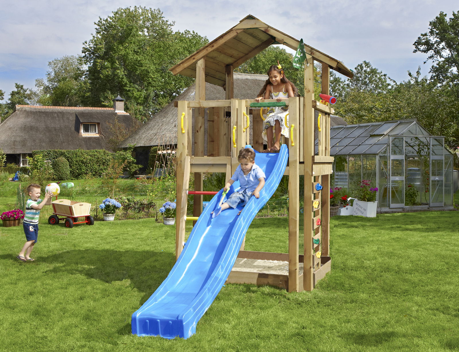 Legetårnet fungerer som en sikker klatre- og legestruktur i haven. Børnene klatrer op ad stiger, krydser broer, leger i legehuset og suser ned ad rutsjebanen — alt sammen mens de skaber deres egne fantasifulde lege.