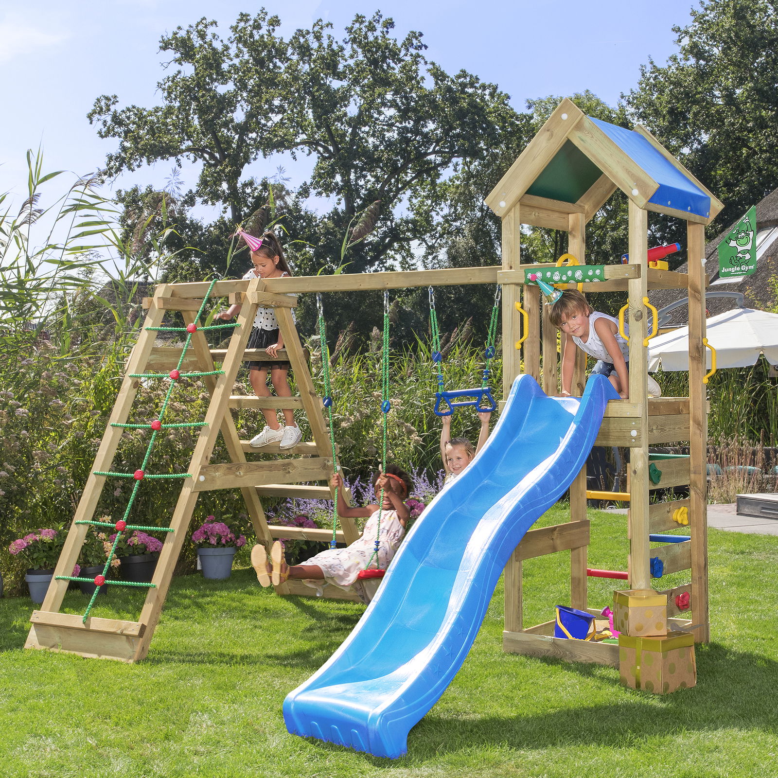 Jungle Gym Patio legetårn komplet inkl. klatremodul 2 og blå rutsjebane 3.798,00 kr. Gå til shop