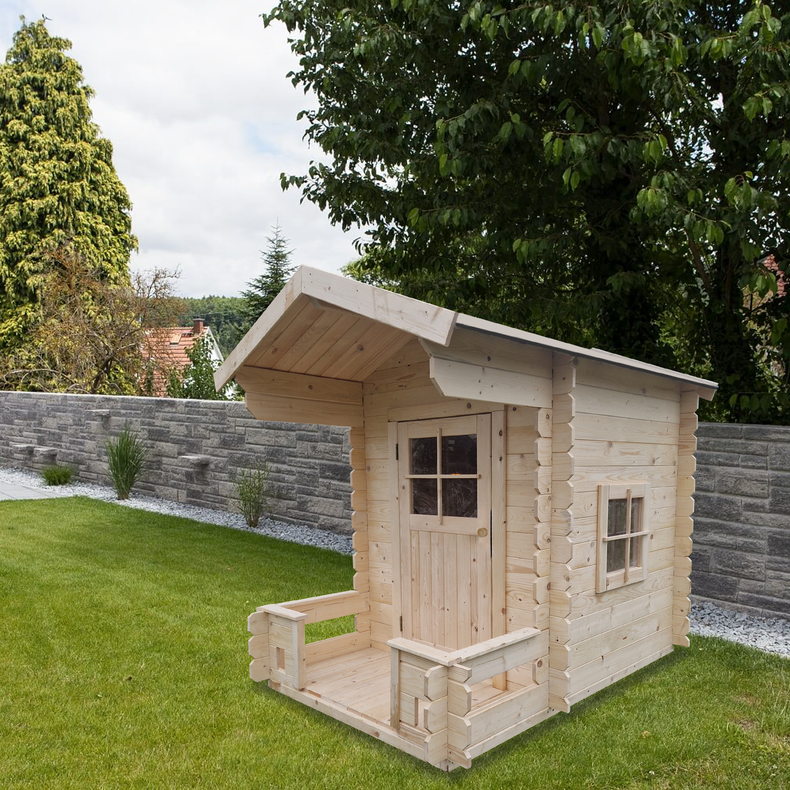 En veranda eller en lille terrasse øger legeværdien. Her kan børnene sidde, byde venner velkommen eller lege butik. Forældre sætter ofte pris på denne funktion, fordi det udvider det anvendelige areal.
