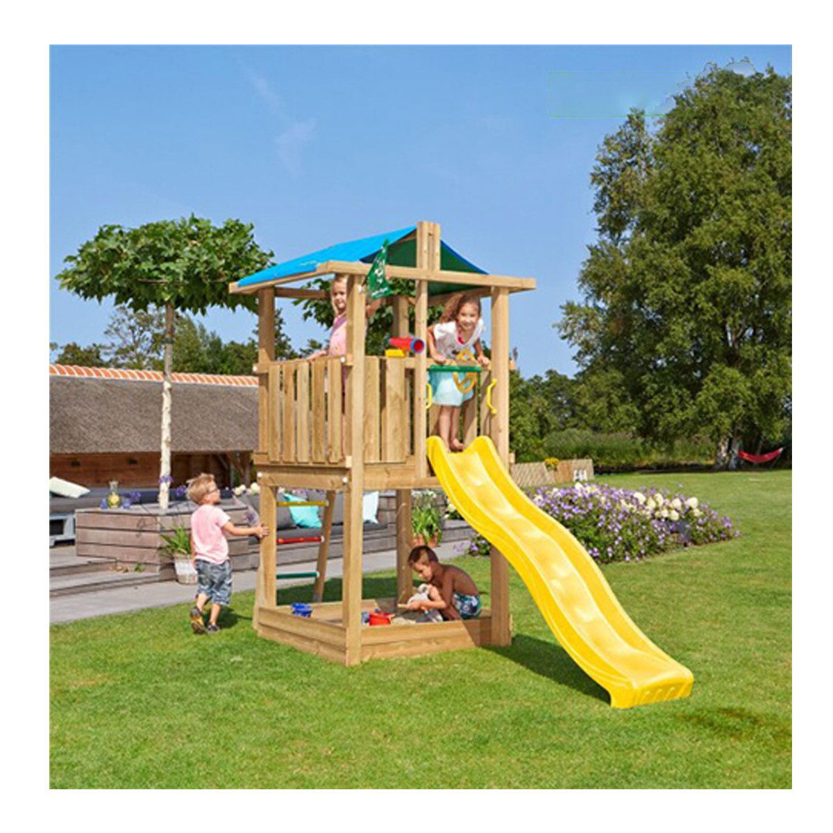 Legetårn med trætag og klatremodul – timevis af sjov og udfordringer! Gør baghaven til børnenes ultimative legeplads med dette robuste legetårn med trætag og klatremodul inkl. gynge. Legetårnet er designet til aktive og eventyrlystne børn, der elsker at