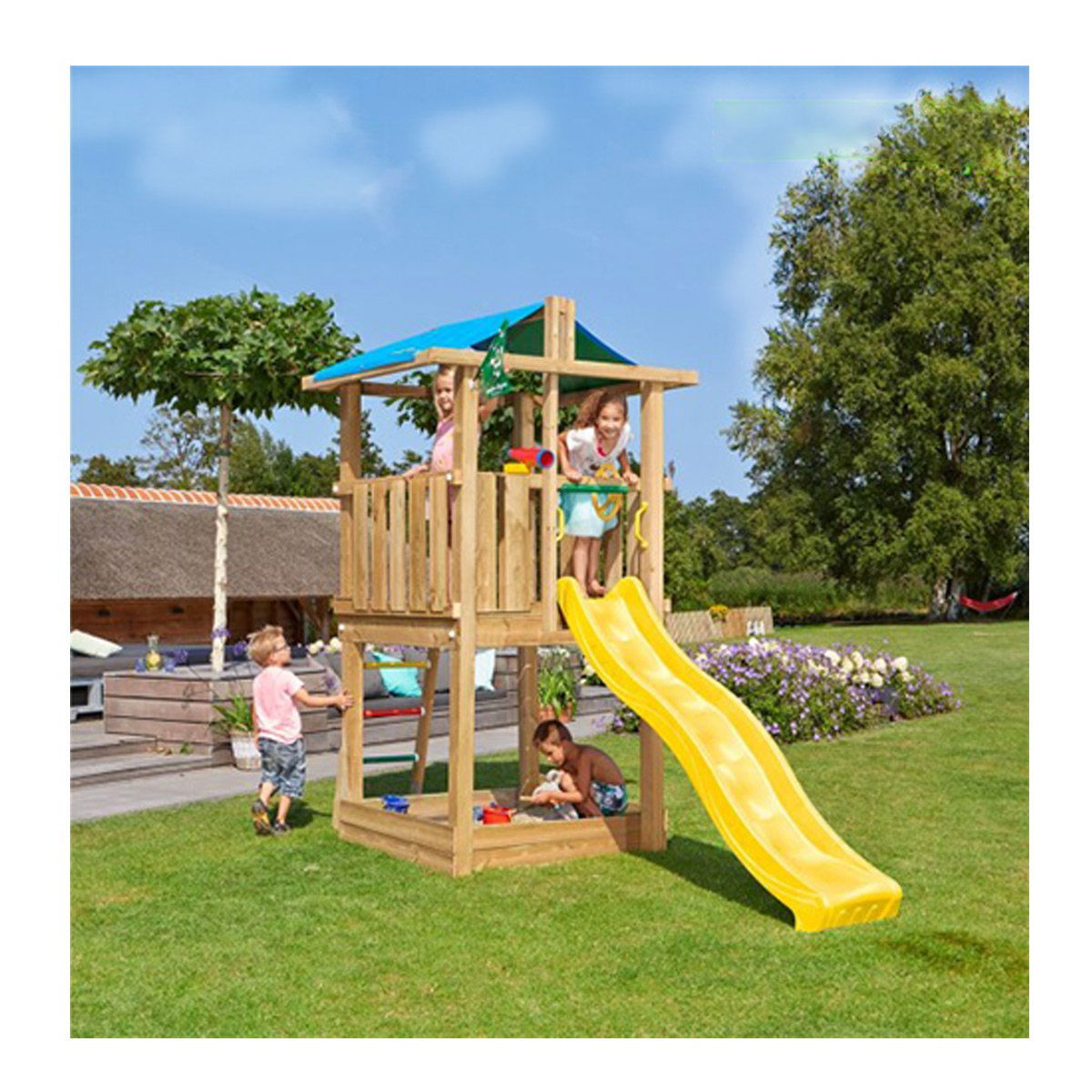 Jungle Totem 2-Gyngemodul – Stilfuldt & Sjovt Legetårn til Haven Giv dine børn et eventyrligt og moderne legeområde med Jungle Totem 2-gyngemodul! Dette kompakte og stilfulde legetårn kombinerer gynger, rutsjebane, klatring og hyggelige funktioner, der