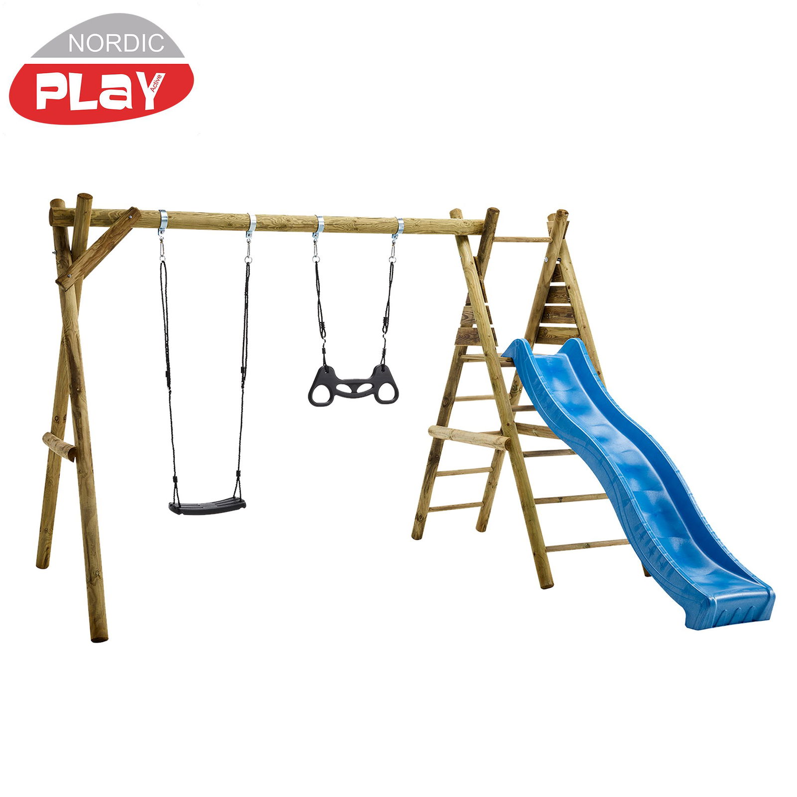 Nordic Play – Gyngestativ 240 cm med platform m/1 sort gynge og 1 sort trapez inkl. blå rutsjebane