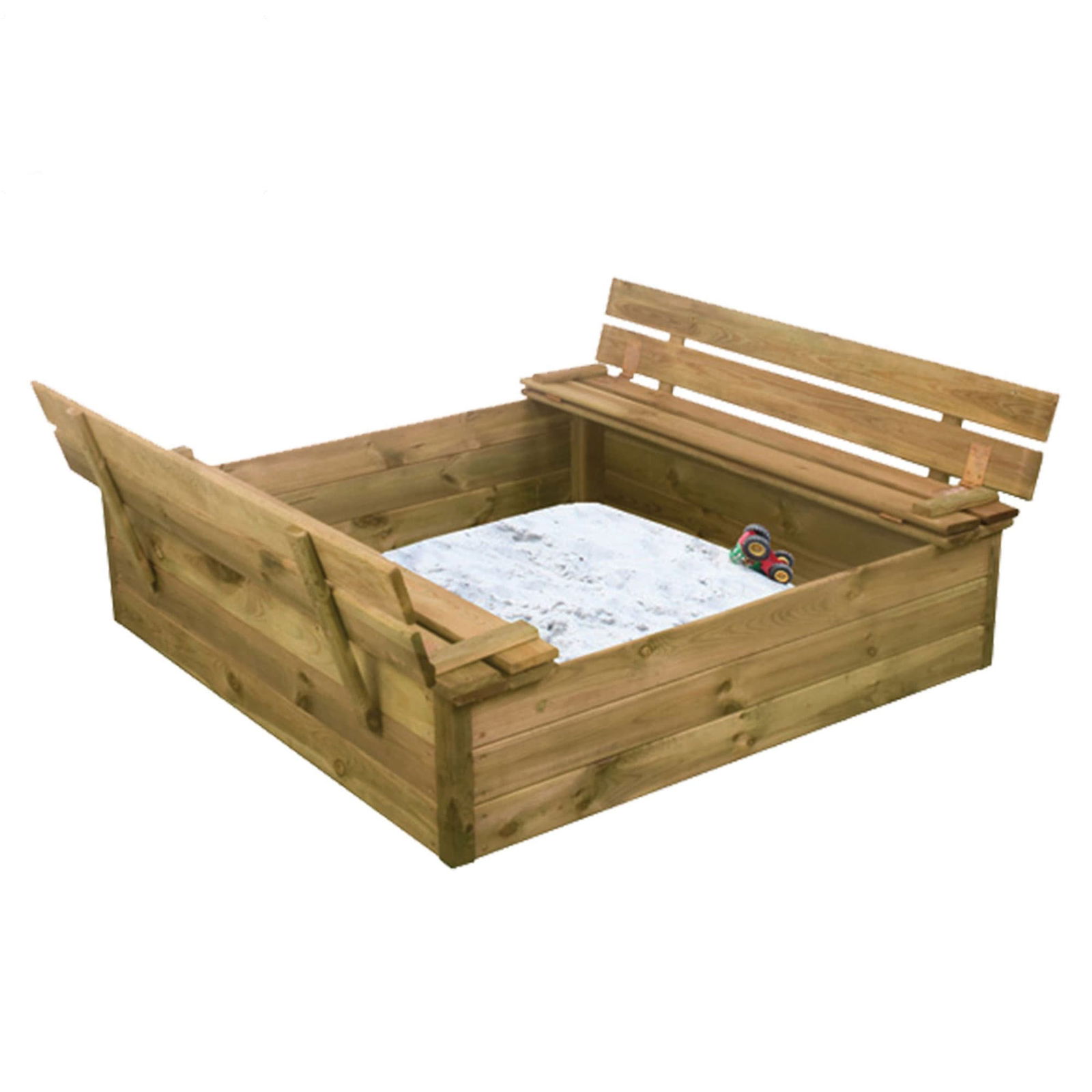 Sandkasse i lyst træ, 120x120x120cm integrerede bænke